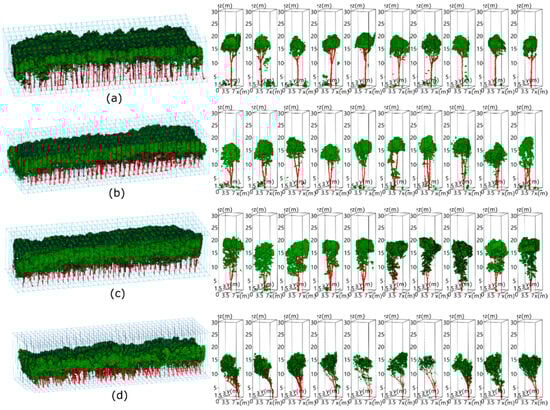 To generate training data for the deep learning model, fine-grained point clouds at individual tree scales were extracted by the voxelization of forest point clouds. To ensure that each generated voxel was likely to contain point clouds of a single tree in the equidistantly planted experimental plot, we set the voxel size to a length of 7 m, width of 3 m, and height of 30 m, which is in accordance with the fixed tree spacing. Meanwhile, we set the voxels in a consecutive order along the marshaling sequence of each tree trunk, thereby covering the point clouds of the whole forest plot. Voxelization results for the subset plots are depicted in Figure 2. We employed a machine learning algorithm [], assisted by manual refinement, to classify leaves for the collected point clouds, with the partial segmentation results shown in Figure 3. The labeled wood and leaf points in each voxel were fed into the deep learning network for classification.