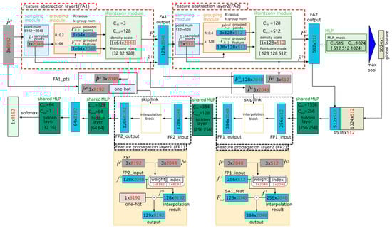 The feature propagation pipeline, illustrated in the bottom half of Figure 3, maps and propagates global features by the skip-link concatenation of point features, with some points omitted by the interpolation block.