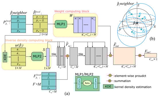 Since point clouds are inherently unordered and do not align with regular grid structures, they cannot be processed using standard convolutional methods. To overcome this challenge, we developed the iPointConv module, which incorporates a Kernel Density Estimation (KDE) algorithm []. KDE is a method used to estimate the probability density function of a random variable based on its neighboring points. In theory, KDE permits an observation to be a part of an infinite number of neighborhood sets, leading to a filtering or smoothing effect on the distribution shape, similar to a convolution operation. The choice of an optimal bandwidth, akin to the size of a convolution filter, critically affects the outcomes because the density of the data varies across the support region of the distribution. To maintain a consistent kernel approximation, the bandwidth should be reduced as the sample size within the support region increases. Using an inappropriate bandwidth that is too large can lead to oversmoothing, which degrades the quality of the probability density estimation. Accordingly, we introduce the correction coefficient with a unit geometric mean. To adapt the sample point bandwidth to the density of local data, this coefficient is used as a scale factor for the global fixed bandwidth . Thus, the kernel density can be approximated as