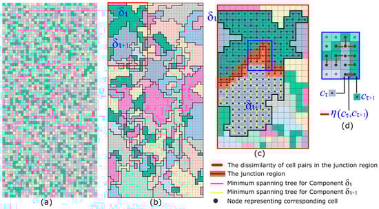 The external difference between two adjacent components and is assigned to the minimum value among the corresponding to pairs of adjacent cells within the region of connectivity between two adjacent components and , where and . A schematic diagram of the two components is shown in Figure 5b, with the corresponding junction region shown in Figure 5c. All cells in the region of connectivity correspond to an edge where the two adjacent components meet. In the algorithm’s initial state, the external difference of the two components equals , as each component only contains one cell. In subsequent iterations, the external difference of and is computed by the following formula:
