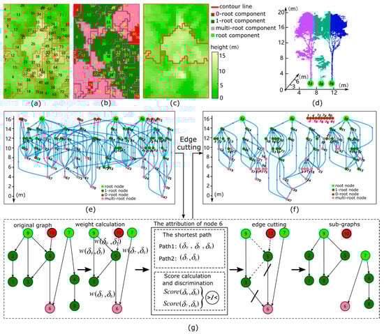 In the inverted DSM, groups of components with similar height cells represent specific parts of a tree (Figure 6a), such as the trunk or a cluster of leaves. We constructed a digraph to concatenate all components using an adjacency relationship (Figure 6b), and subsequently segmented the graph into subgraphs to complete the inverse DSM segmentation (Figure 6c,d). For ease of understanding, we refer to any subsequent graph nodes as components, i.e., . Each component has an elevation value set by the average height value of its constituent cells. The root component is denoted as , represented in light green in Figure 6e.