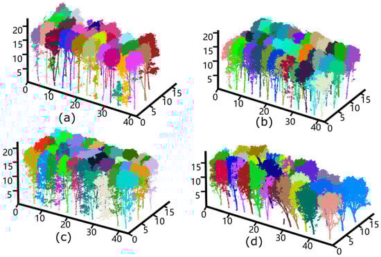 The illustration of individual tree segmentation. (a–d) Corresponds to Plot 1–4.