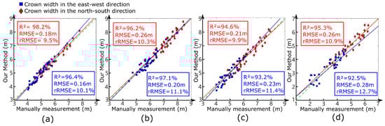The obtained crown widths in the north–south and east–west directions were compared with field data. We adopted a linear regression for qualitative assessment, and the R-squared, root-mean-squared error (RMSE), and relative root-mean-square error (rRMSE) measures for quantitative assessment, wherein the rRMSE is the ratio of the RMSE to the observed mean values [].