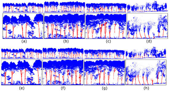 Comparison of the trunk recognition results obtained from raw PointNet++ (a–d) and improved PointNet++ (e–h). Each graph showcases a row of trees and its enlarged part.