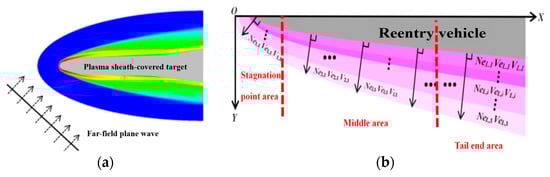 During high-velocity motion of near-space hypersonic vehicles, the high-velocity incoming flow causes energy conversion, during which enormous kinetic energy is transformed into internal energy that causes high temperature. According to the “real effect of high-temperature gas”, the vehicle surface is enveloped in a PSh [,], which changes the target electromagnetic (EM) characteristics of hypersonic vehicles. When the EM wave propagates in the PSh, charged particles and various ablation products will cause certain complicated EM effects on EM waves, resulting in a poor EM environment of the target and severe distortion of the EM wave [,].
