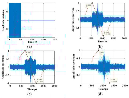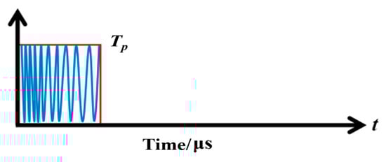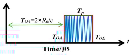 It can be observed that the range causes an envelope offset of the echo signal. In Figure 2, the start time of the transmitting signal is 0, and the end time is the pulse width Tp of the signal. In Figure 3, the envelope of the echo is offset to the right side along the time axis, and its start time correlates with the delay of the echo signal coupling. Combining Equations (13) and (14), we can further conclude that the envelope offset of the echo is τ0, while its time delay τ0 can be equivalent by extracting its start time.