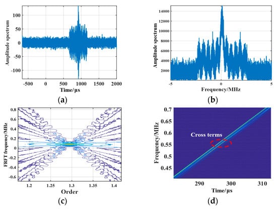 (a) Echo signal; (b) Frequency-domain echo signal; (c) Result of the FRFT of the echo signal; (d) Wigner–Ville transform result of the echo signal.