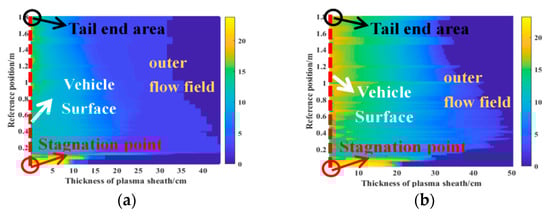 As shown in Figure 10, with the increase in flight altitude, the electron density of the flow field decreases, but the thickness of the plasma sheath also increases accordingly. At the position close to the vehicle surface, the range of the flow field whose velocity is close to the target velocity gradually increases. The descending gradient of the flow-field velocity within the stagnation point area is approximately constant, the descending gradient of the flow-field velocity in the middle area and the tail-end area decreases.