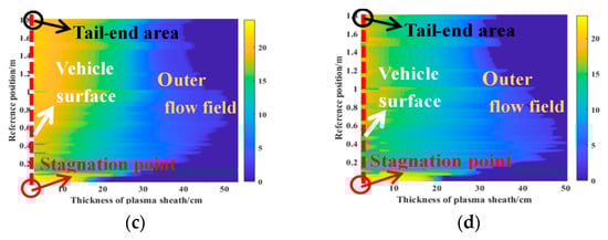 Reflection coefficient of plasma sheath to electromagnetic wave at an altitude of 30 km: (a) fc = 3.3 GHz; (b) fc = 5.8 GHz; (c) fc = 9.5 GHz; (d) fc = 18 GHz.