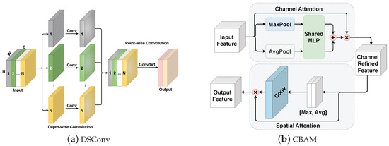 In this subsection, we provide a brief description of the classical lightweight design, depthwise separable convolution [36] (DSConv), and the hybrid attention mechanism. DSConv mainly consists of two operations, depthwise convolution (DWConv) and pointwise convolution (PWConv), which significantly reduces the number of parameters and computation compared to standard convolution. As shown in Figure 1a, DSConv separates the input features along the channel dimension, then independently performs the single convolution operation for each feature channel, and finally, concatenates the outputs and performs feature fusion and scaling along the channel by 1×1 PWConv.