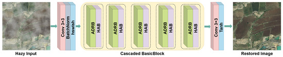 The overall architecture of the LRSDN model is depicted in Figure 2. The network takes a hazy remote sensing image as the input and first passes it through a conventional convolutional neural network structure, including a convolution layer, a batch normalization layer, and an activation operation. This shallow structure rapidly expands the number of channels in the input data, laying the foundation for subsequent feature extraction. Subsequently, the output feature maps from the shallow structure passes successively through several cascaded basic modules, marked as BasicBlock in Figure 2. These base modules gradually extract the high-level semantic features of the haze image, enabling the model to deeply understand the latent pattern of the haze. Simultaneously, we introduce a hybrid attention mechanism to recalibrate the feature map to further improve the quality and utilization efficiency of the features. Within the BasicBlock, the ADRB module focuses on extracting features and enhancing the representation capabilities of the model. The HAB module, on the other hand, is responsible for feature recalibration, which enables the model to better cope with complex haze distributions by refining the features. The specific implementations and principles of these two modules will be elaborated in Section 3.2 and Section 3.3, respectively. Finally, the model directly outputs a dehazed result through a 3×3 convolutional layer and a Tanh activation.