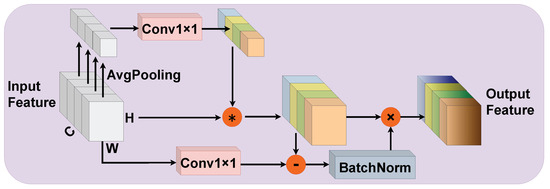 where and represent the input features and recalibrated output features, respectively. describes the simplified channel attention. * and ⊗ represent channelwise and elementwise multiplication operations, respectively. indicates the batch normalization, and means the point convolution operator.