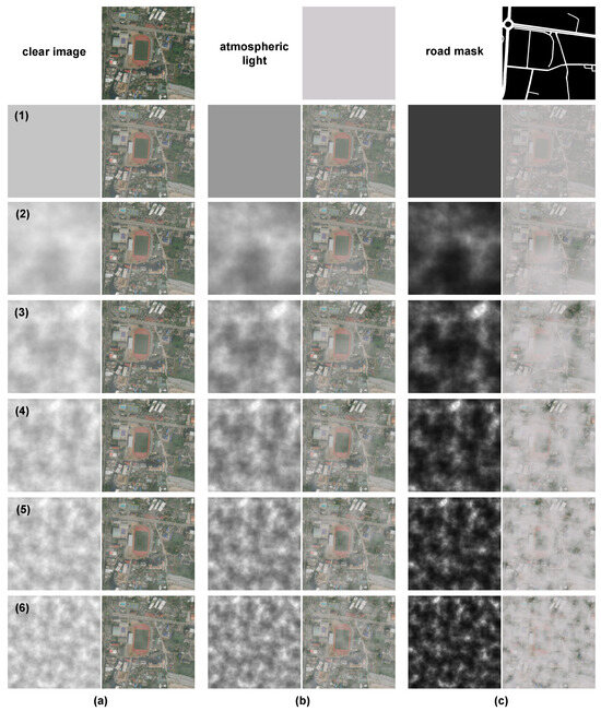 Given Perlin noise’s capability to effectively simulate natural textures, we incorporated it into synthesizing remote sensing haze images. Combining it with the atmospheric scattering model, we utilized Perlin noise to generate the scene’s transmission map and randomly generate atmospheric ambient light, to ultimately simulate hazy remote sensing images, as depicted in Figure 5. In this study, we employed the implementation of Perlin noise provided by the open-source project perlin-numpy (https://github.com/pvigier/perlin-numpy (accessed on 8 October 2023) ) and set the period parameter of the noise along each axis to 8 and the octave parameter of the noise to 5, with all other parameters following the default settings. The noise is first normalized to the range [0, 1], and then, it is nonlinearly transformed according to the formula , where n(x) denotes the normalized noise and is the parameter to control the concentration of the haze, and we set it to 0.5, 1, and 3 for generating thin, moderate, and dense haze, respectively. After that, we performed the “crop-and-resize” operation on to control haze uniformity by the cropping ratio. In Figure 6, the cropping ratios of the transmission maps from rows (2) to (6) are 1/25, 4/25, 9/25, 16/25, and 1 (i.e., no cropping), respectively, whereas the transmission of the homogeneous haze sample is set to the mean value of . As for the global atmospheric light, we randomly generated it based on haze concentrations (ranging within [0.7, 0.8], [0.8, 0.9], and [0.9, 1] for thin, moderate, and dense haze).