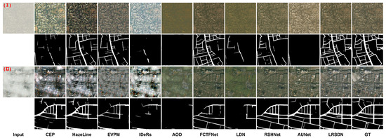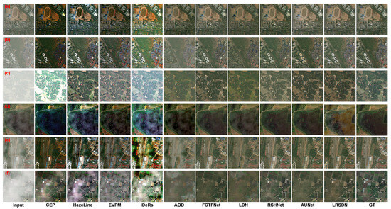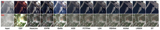 We first conducted dehazing experiments on the proposed RSHD and compared the LRSDN with existing state-of-the-art methods using both visual evaluation and quantitative assessments. As described in Section 4.2, the RSHD is a fine-grained remote sensing hazy image dataset synthesized based on Perlin noise with varying haze concentrations and uniformities. The dataset is divided into two parts based on haze uniformity: RSHD-H for homogeneous haze and RSHD-IH for inhomogeneous haze. Each part is further subdivided into three subsets based on haze concentration, “dense”, “moderate”, and “thin”, resulting in six test subsets labeled with the suffixes -D, -M, and -S (i.e., RSHD-HD, RSHD-HM, RSHD-HT, RSHD-IHD, RSHD-IHM, and RSHD-IHT). As listed in Table 1, each of these six test sets contains 510 pairs of hazy and haze-free images with a resolution of .