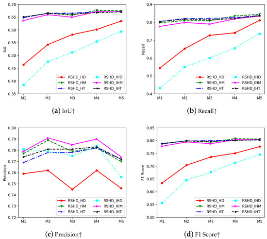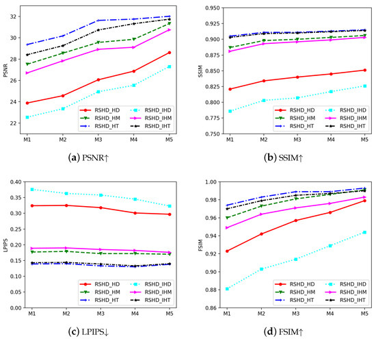 We initially assessed the dehazing performance of various variant models based on the quality of haze image restoration. We adopted these models to remove haze for all samples from the six test subsets of the RSHD and then calculated their average full-reference evaluation scores, as shown in Figure 13. On the basis of the baseline, the sequentially embedded ADRB and HAB modules both significantly enhance the dehazing performance, resulting in significant increases in the PSNR, SSIM, and FSIM of the restored images, while the LPIPS exhibits a decreasing trend. This is because the LPIPS is a learning-based image-evaluation method, which is trained on a large number of learning samples, causing it to be insufficiently sensitive to subtle changes in the image pixels. In addition, comparing M2, M3, and M4, we found that channel attention had a significant improvement for haze image datasets with various concentrations and uniformity, while pixel attention had a limited effect on images with thin haze (shown as blue and black dashed lines in Figure 13). This is because the design goal of pixel attention is to capture regions of dense haze, which is not obvious on the thin haze image datasets. In particular, the enhancement of the dehazing effect is more remarkable on dense haze datasets (RSHD-HD and RSHD-IHD), with an average increase of 20% in the PSNR score.