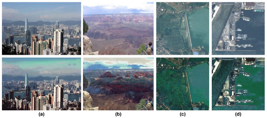 Although the LRSDN algorithm demonstrates promising dehazing performance in most cases, it may fail in some specific scenes. As shown in Figure 16, the inputs of (a) and (b) are natural scene images, and the LRSDN fails to remove the haze successfully, producing intolerable color spots in the sky region, which is due to the domain gap between the natural scene images and the remotely sensed images. While the inputs of (c) and (d) are remote sensing images with large areas of monotonous colors, the LRSDN suffers from over-enhancement and incorrectly restores colors in the dark parts of the water body. In future work, we will dedicate our work to addressing these issues. From the perspective of model design and deployment, it is a persistent challenge to further reduce the model’s computation and parameter counts while ensuring the network’s dehazing performance. In addition, there is a huge research space for model deployment and application on edge devices with extreme resource constraints (e.g., micro UAVs). Lastly, the dataset is a crucial factor for research progress. We proposed a haze-image-simulation algorithm based on Perlin noise to construct paired hazy and clear data for supervised learning. However, the domain gap between simulated data and real-world images is still non-negligible. In natural image dehazing, researchers have attempted to use specialized haze machines to generate real haze [55] instead of synthesizing hazy images. However, this approach is difficult to apply in remote sensing scenarios because of the imaging differences between remotely sensed imagery and natural photographs (e.g., the range, distance, and timing of imaging). Multi-temporal, multi-spectral, and hyperspectral data from remote sensing satellites may offer insights into solving this problem.