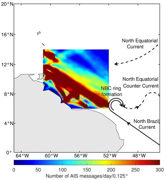 Schematic of major ocean currents in the Western Tropical North Atlantic ocean (WTNA) superimposed on the density plot of ship traffic expressed as the daily mean number of received AIS messages per bin of 0.125°. The density is calculated for the region considered in this study, spanning longitudes from 61°E to 52°W and latitudes from 7°N to 14°N.
