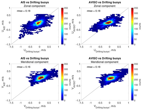 Figure 2 presents two-dimensional histograms which compare sea surface current estimates from the AIS and AVISO datasets with colocated measurements from drifting buoys. The first row illustrates the zonal component, while the second row depicts the meridional component, with AIS data shown on the left and AVISO data on the right. Notably, the accuracy of both datasets is quite similar when compared to the drifters, with both AIS and AVISO exhibiting a root-mean-square error (RMSE) of 0.18 m/s for the zonal component. Additionally, we observe a relatively slight improvement in RMSE for the AIS meridional component (0.16 m/s vs. 0.18 m/s). Interestingly, for the AVISO zonal component velocities (first row), the lowest absolute values never exceed −0.5 m/s. This, however, is clearly not the case for the AIS zonal estimates, where the absolute values quite regularly exceed −0.5 m/s.