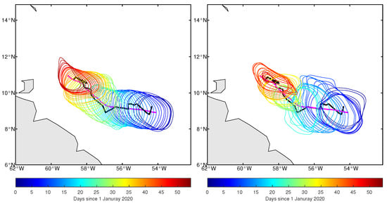 The trajectory of the NBC ring spanning from 1 January to 16 February 2020 (AVISO in magenta and AIS in black), along with the daily shapes of the detected eddies by AMEDA. Left panel for AVISO and right panel for AIS.