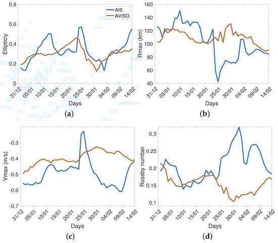 Temporal variability of NBC ring parameters as derived from AMEDA using AIS (blue curves) and AVISO (red curves) velocity fields. (a) Ellipticity, (b) Rmax, (c) Vmax, and (d) Rossby number (Ro) over the 46 days of NBC ring tracking.