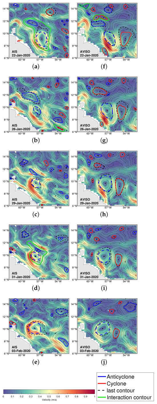 Conversely, the AIS eddy experienced a sudden drop in its diameter around the 25th of January, reaching 80 km, which then gradually increased until reaching 160 km, ultimately matching the size observed for the AVISO eddy by mid-February. The NBC ring eventually weakened in the second half of February before colliding with the Lesser Antilles, where the eddy broke up and dissipated by interaction with the topography [2,9,10,11,18]. The eddy vanished from the AIS map on February 17th, but it remained visible on the AVISO dataset for an additional week, approximately corresponding to the altimetry mapping decorrelation time.