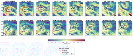 Another significant process, not present in the AVISO data but solely detected through the AIS data, near the NBC ring in February involved the merging of two cyclones. This particular merging event is shown in Figure 6 through consecutive snapshots taken intermittently from February 5th to February 19th of ocean surface datasets derived from the AIS (top panel) and altimetry (lower panel). From February 1st to 5th, snapshots revealed the gradual approach of the two cyclones towards each other, resulting in the formation of a connected region by 11 February, as indicated by the black dashed curve detected by AMEDA. Subsequently, they begin to aggregate, forming a larger eddy. On February 11th, only a single eddy is observed in the snapshot, confirming the occurrence of cyclone merging. On the AVISO side, AMEDA began detecting the cyclonic eddy from February 7th, which continued to grow in size following the same trajectory as the AIS eddy, without showing any merging event.
