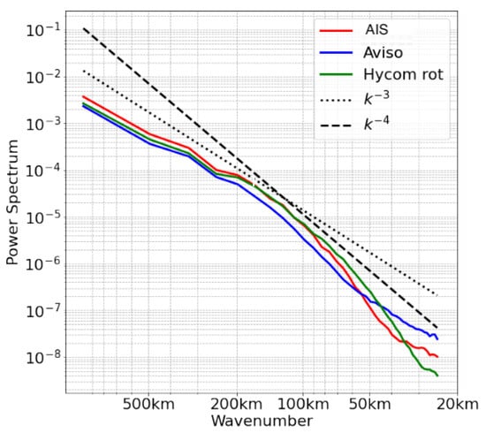 Figure 7 shows the power spectra of sea surface velocities (kinetic energy spectra) for the rotational part of the AIS velocities (called OS rot), the AVISO geostrophic velocities, and the rotational velocities from a HYCOM model simulation (called Hycom rot) at a th-degree resolution. The nonlinearity of this HYCOM simulation with altimetric data assimilation allowed the generation of smaller scale features than rings. The usual spectrum of two-dimensional turbulence in the inertial range of enstrophy cascade [40,41,42] was recovered for scales larger than 250 km. Note that that scale was comparable with the Rhines scale of turbulence on the beta-plane [43]. Indeed , which provides, with typical values of the current in the region ( m/s) and /(m.s), km. A slope discontinuity appeared at that scale, yielding a steeper spectrum down to scales of about 80 km. Indeed, the presence of developed vortices in turbulence rendered the spectra steeper than [44,45,46,47]. This spectrum steeper than predicted by the phenomenological theory could also be related to the presence of vorticity filaments [48]. For even shorter scales, ( km), while the AVISO data joined the phenomenological spectrum (mostly due to energy spreading between scales via data interpolation), the AIS velocity spectrum remained in agreement with the high-resolution HYCOM simulation. This evidenced the presence of stronger vorticity gradients in these latter results than in AVISO’s.