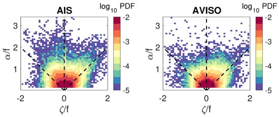 The observations made on the last figure drew us towards a joint analysis of the normalized vertical vorticity and normalized lateral strain rate [49]. The steepness of the energy spectrum with the AIS data reflected clear-cut vorticity fronts. Joint statistics of the normalized vertical vorticity and normalized lateral strain rate are shown in Figure 8, where and (respectively, and ) are the derivatives of the zonal (respectively, meridional) component with respect to the x-axis and y-axis. f is the Coriolis parameter. The plots show how different the vorticity and strain distributions were between the AIS and AVISO data: the AIS data indicated (on average) stronger values of vorticity, with a slight bias towards negative values (i.e., more anticyclonic eddies), and stronger values of the (negative) strain rate. Again, this is in agreement with more intense and sharper flow features in AIS data.