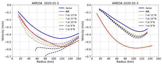 Radial profiles of velocity () in NBC rings for 5 January (left) and 3 February (right), 2020. The profiles for AIS and AVISO eddies are displayed in blue and red, respectively. Profiles corresponding to cyclogeostrophic balance from the pressure field, calculated with different Coriolis frequencies “f”, are shown in dashed lines.