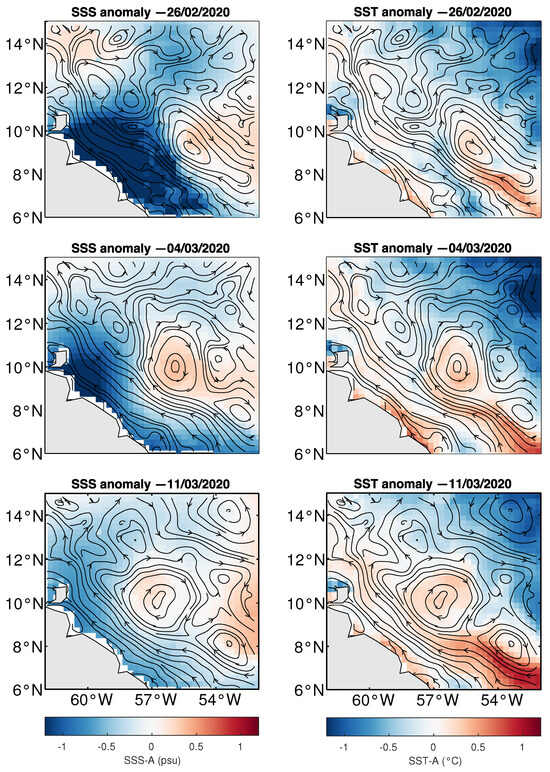 Another quality check (and usefulness validation) of the AIS data at the regional scale is provided by the comparison between the AIS currents and SSS or SST maps (see Figure 10). The left-hand column indicates—but for a small anomaly at 9°N–57°W—how well the freshwater plume from the Amazon River is advected by the velocity field, and in particular, how it is funneled along the coast, inshore of the NBC rings. Further west, this freshwater circulates anticyclonically around the western NBC rings—at 10°N–57°W.