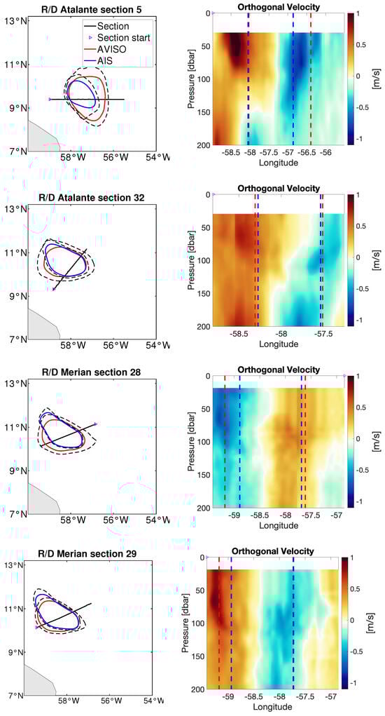 ADCP sections performed by R/V L’Atalante and R/V Maria S Merian during the EUREC4A-OA experiment. The first to fourth rows correspond to Sections 5 and 32 of R/V L’Atalante and Sections 28 and 29 of R/V Maria S Merian (in chronological order), respectively. For each section, the first panel shows the trajectory of the R/V in black, with the magenta triangle indicating the beginning of the section. Red and blue contours represent the NBC ring detected by AMEDA in AIS and AVISO currents, respectively. The black dashed line indicates the last closed contours. The second panel displays the velocity orthogonal to the section, as measured by the ADCP. Red and blue vertical dashed lines indicate the maximum velocity contours provided by AMEDA.