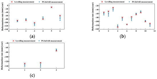 Comparison of PS-InSAR monitoring results and leveling monitoring results from (a) 2005 to 2013, (b) 2015 to 2016, and (c) 2013 to 2018.