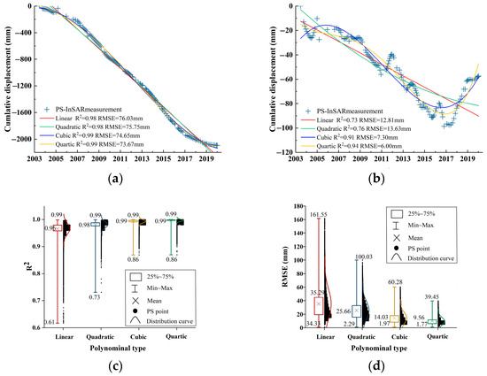 Two PS points (P1 and P2) were selected, located at the center and the edge of the land subsidence funnel (Figure 2a). Using different polynomials to fit the time-series settlement of two PS points from 2003 to 2020, compared with the linear and quadratic polynomial fitting methods, the fitting curves of the cubic and quartic polynomials were consistent with the time-series settlement curve (Figure 4a,b). Comparing the R2 and RMSE of the fitted settlement at all PS points with the linear regression analysis of the settlement monitored by PS-InSAR, the cubic and quartic polynomials exhibited a better fitting effect on the overall area, the R2 range was 0.86–0.99, and the ranges of RMSE were 1.97–60.28 and 1.77–39.45 mm, respectively (Figure 4c,d). Higher degree polynomials can fit the data more closely, but they can also lead to overfitting, where the model starts to capture noise in the data rather than the underlying trend [44]. Higher-degree polynomials can be more computationally intensive and harder to interpret. Compared with complex quartic polynomials, the cubic polynomials were solved with fewer parameters, were computationally efficient, and could fit the time-series settlement curves better.