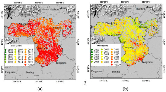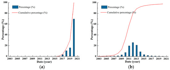 Figure 5 shows the spatial distribution characteristics of the time when the maximum settlement occurs and the time at the inflection point of the fitted curve. Figure 6 shows the statistical results of the corresponding period of occurrence. The results show that the period of occurrence of the maximum settlement was concentrated between 2015 and 2020. The period of occurrence of maximum settlement at 30.51% of the PS points was concentrated from 2015 to 2019, and these points were concentrated near the edge of the subsidence region; 69.49% of the PS points with maximum settlement were concentrated in 2020, and these points were located in the subsidence center (Figure 5a and Figure 6a). This indicates that the land subsidence center continued to increase during the period of 2003–2020, and sedimentation in the edge region began to decrease from 2015 to 2019. During the period of 2003–2020, 96.64% of the PS points had inflection points in their time-series subsidence curves. The inflection periods of 86.58% of the time-series subsidence curves of the PS points were concentrated between 2010 and 2015, indicating that the subsidence rate of these areas reached its maximum in 2010–2015 and then decreased. Meanwhile, 4.82% of the time-series subsidence curves of the PS points were concentrated in 2016–2020. Furthermore, these PS points were concentrated in the subsidence center region of Chaoyang and the subsidence edge region of Tongzhou (Figure 5b and Figure 6b). Notably, 2.33% of the PS points had inflection periods after 2020, and these PS points were most concentrated in the Tongzhou subsidence edge area.