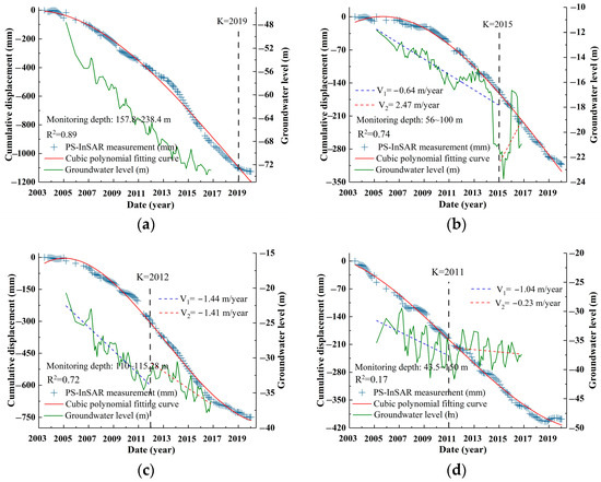 Several previous studies revealed a nonlinear trend in deformation development in Beijing owing to the overexploitation of groundwater and the implementation of the South-to-North Water Diversion Project [39,40,41]. Polynomial fitting is a method that approximates the relationship between data points through polynomial equations. It is widely applied in the processing of time-series data [42,43], because it can effectively capture the complex nonlinear patterns and trends in data. Additionally, time-series data may exhibit significant fluctuations within certain periods. Polynomial fitting can adapt to these local changes, providing more accurate predictions. In this study, we used cubic polynomials to model the time-series cumulative deformation for each PS point [27]. The first derivative, D′, of time-series deformation D represents the rate of change in the cumulative variable of change, that is, the deformation rate VD, in mm/year. The deformation rate in the subsidence area was negative, and the subsidence rate VS = −VD. When deformation rate D′ = 0, the time-series variable reaches the minimum value, Dmin (i.e., the cumulative settlement S reaches the maximum, Smax), or the maximum, Dmax (i.e., the cumulative settlement S reaches the minimum, Smin), and the corresponding time, t, is the period tmax or tmin, in which the extreme value of subsidence occurs. The second derivative, D″, represents the rate of change in the deformation rate. When D″ = 0, the rate of change in the deformation rate is 0, and the corresponding period is the inflection point K of the cubic polynomial function. The deformation rate reaches a maximum or minimum value at K, and in the settlement region, it corresponds to the subsidence rate reaching the minimum or maximum VS. The formulas for the extreme period and the inflection point K are as follows: