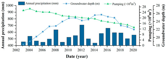 Annual precipitation, groundwater depth, and pumping in Beijing from 2003 to 2020.