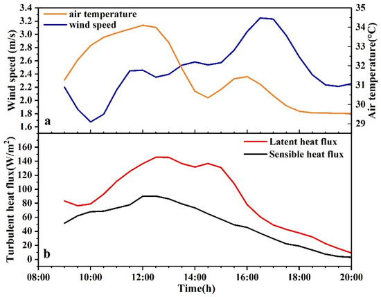 The wind speed was low on the day of the test, as shown in Figure 3a. The measured data show that both LE and H peak around midday, followed by a rapid decrease in turbulent heat flux after 15:30, which is consistent with the change in wind speed. Higher wind speeds increase the mixing and convection of heat and water vapor in the air, thereby increasing the rate of heat transfer and resulting in higher LE and H. The significant temperature difference between 10:00 and 16:00 led to high heat transfer through conduction and convection per unit area, resulting in a high H. There was also an increase in the saturated vapor pressure difference in water vapor, which increases the latent heat energy. As a result, turbulent heat fluxes were higher during the period when wind speed and temperature differences were higher.