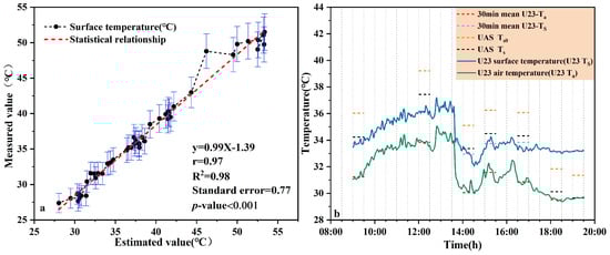 Calibration of thermal infrared image inversion for surface temperature. (a) Correlation between measured and inverted surface temperatures; (b) surface temperature measured by U23-001, air temperature measured by U23-001, and pre-calibration surface temperature (UAS TS0) and corrected surface temperature (UAS TS) before inversion of UAS thermal infrared images during the daytime hours of the UAS test.