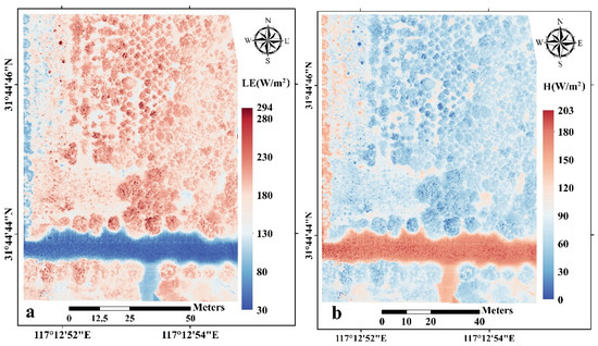 (a) The spatial distribution of LE in the study area, estimated from data obtained during the 12:30 period of flight time, (b) the spatial distribution of H during the same period.