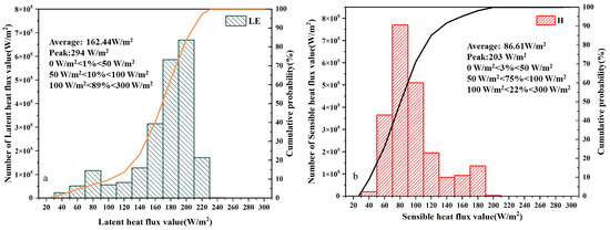 To verify the accuracy of the turbulent heat flux values estimated from the UAV data, the mean values of LE and H at each pixel point in the study area were compared with the actual EC measurements. The results show that the estimated LE during the 12:30 flight period had an average value of 162.44 W/m2, and the estimated H had an average value of 86.61 W/m2 in the study area; the results of the heat flux estimation for each pixel point are shown in Figure 11. The LE values were mostly distributed between 100 and 300 W/m2, accounting for 88.73%, and the H values were mostly distributed between 50 and 100 W/m2, accounting for 75.16%. The range of H values was smaller than that of LE, indicating that the study area has a large vegetation cover. Potential evapotranspiration was high during the day, and most of the area showed a high latent heat status. This is attributed to the predominant vegetation cover in the area, which converts some of the heat flux to latent heat through transpiration, thus reducing H. Furthermore, the low wind speed on the day of the test resulted in a lower heat exchange rate between the atmosphere and the surface. The test was carried out in summer, with intense solar radiation and prolonged insolation, resulting in more solar energy being absorbed by the surface. Some of the H was used to heat the surface and was not transferred to the atmosphere. Consequently, LE was higher than H during this period.