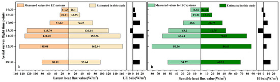 To further analyze the results of the estimation based on UAV-captured data using the semi-empirical triangle method, data from several other flight periods were processed to obtain LE and H for different periods within the same day in the study area. These estimates were then compared with the measured fluxes obtained from the EC observation system, as shown in Figure 12. The deviations of the latent and sensible heat flux estimates from the eddy correlation covariance observations were less than 25 W/m2 in all seven sets of tests. The maximum deviation of the LE value was 23.11 W/m2, and the minimum deviation was 4.43 W/m2, while the maximum deviation of the H value was 15.45 W/m2, and the minimum deviation was 3.42 W/m2. Considering that an absolute error of <50 W/m2 is considered desirable [46], the method is considered reliable for estimating turbulent heat fluxes.