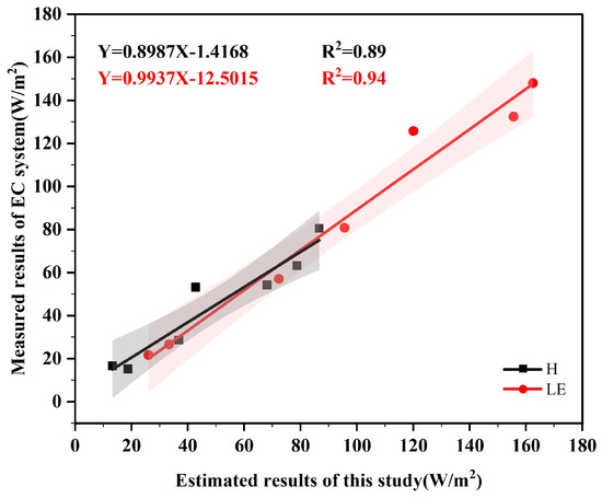 The model plot of the relationship between turbulent heat fluxes estimated using UAV-captured data and the measured EC values. The UAV estimates are represented by X, and the measured values are represented by Y. The dark gray area represents the 95% confidence interval of the H model, while the light pale pink area represents the 95% confidence interval of the LE model.