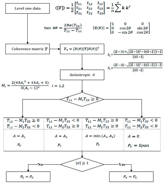 Therefore, the orientation angle compensation can somewhat solve the problem of overestimation of the volume scattering power component. At the same time, the increase in has obvious improvement regarding the problem of negative power value because one of the main reasons for the negative power value of surface scattering or double bounce scattering is that . For the second condition, we dealt with it using orientation angle compensation. So, the first condition will be our main basis for determining the adaptive parameters. Choosing a minimum A value that satisfies the first condition is the determined optimal parameter value. Figure 6 shows the whole process of this algorithm.