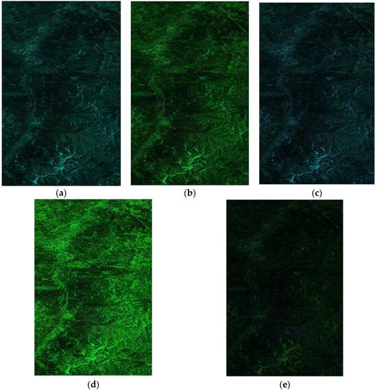 RGB syntheses of polarimetric target decomposition algorithm. (a) FRE2; (b) Y4R; (c) HTCD; (d) OSM; (e) proposed.