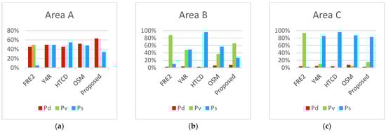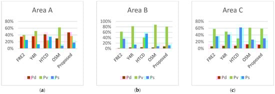 In order to quantitatively evaluate the scattering components, three well-characterized test areas were selected for the experiment for specific data analysis, as shown in Figure 7: Area A, located in the area of man-made buildings; area B, located in the area of municipal grassland; and area C, a relatively sparse area of grassland containing a highway. Table 1 gives the proportion of distribution of each polarimetric component in all methods for the three regions. In order to make the comparison between algorithms more obvious, we visualized Table 1 and generated a data bar graph, as shown in Figure 9. Figure 9 gives the percentage of polarimetric target decomposition components for each algorithm in regions A, B and C.