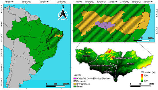 These soil and climate conditions can be observed in various regions of the Brazilian semi-arid region, from areas with a lesser degree of environmental deterioration to locations with advanced desertification processes. The Desertification Nucleus of Cabrobó (DNC) in Pernambuco (PE), Northeast Brazil (NEB), like most semi-arid areas, experiences limited and uneven rainfall distribution, with the majority of rainfall occurring in a few months of the year and periods of drought [10]. These factors, combined with inadequate planning of natural resource use, can intensify desertification cores [11].