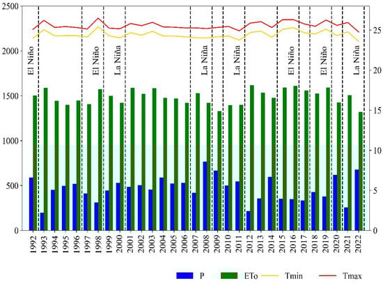 Annual distribution of rainfall (P) (mm), potential evapotranspiration (ETo) (mm), minimum (Tmin) and maximum (Tmax) air temperature (°C), and occurrence of extreme El Niño and La Niña events (strong to very strong) in the DNC in Pernambuco, Brazil, from 1992 to 2022.