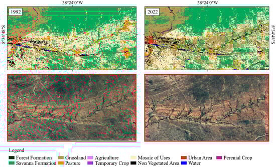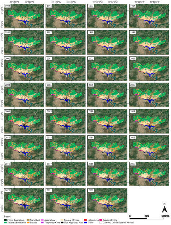 Spatial–temporal distribution of LULC classes in the DNC, Pernambuco, Brazil, from 1992 to 2022.