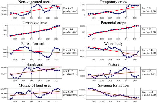 The areas of Forest Formation, Pasture, and other forms of vegetation showed significant changes according to the Mann–Kendall statistical analysis. These changes are related to deforestation, reforestation, agricultural practices, and climate change [47,48]. The Savanna Formation areas exhibited a significant decreasing trend, with a Tau of −0.81. This class includes the Caatinga biome, which is predominant in the region, highlighting a reduction in native vegetation. Temporary crops showed an increase between 1992 and 2022, and Perennial Crops also grew over the years, with Tau values of 0.64 and 0.99, respectively. The mosaic of land use increased its area by 53,567 hectares, a significant increase according to the Mann–Kendall statistical analysis. The sum of the classes “Temporary crops”, “Perennial crops”, and “Mosaic of land use” represented an area of 169,177 hectares in 1992, increasing to 232,686 hectares in 2022, which corresponds to approximately 20% and 27%, respectively, of the total area of 866,863 hectares in the DNC. This growth in Temporary Crops, Perennial Crops, and land use mosaic classes suggests a significant shift in the agricultural landscape over the decades. There was a steady increase in Urbanized Areas between 1992 and 2022, reflecting the ongoing process of urbanization. Although there was an increase in Forest Formation between 1992 and 2001, there was a decrease between 2002 and 2015. According to the Mann–Kendall statistical analysis, there is a decreasing trend in forests, although small. Non-Vegetated Areas showed a significant increasing trend according to the Mann–Kendall statistical analysis, with a Tau of 0.42 (Figure 4).