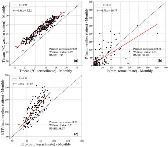 It is important to highlight that automatic meteorological stations collect hourly data (INMET) and generate monthly data from them, whereas TerraClimate only provides monthly data. TerraClimate products are based on resampling data obtained through dynamic downscaling, incorporating information from various databases. These products are used in numerous studies for calibration, comparison, and validation [39,58,59,60].